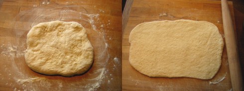 Place the dough ball on a lightly floured surface and press it into a rectangle with your fingers (don’t knead it!). You want to use just enough flour to keep the dough from sticking to your work surface, but not any more than is necessary, otherwise the dough will be too dry. Use a lightly floured rolling pin to roll it into a rectangle about 1 cm thick (the dimensions don’t matter).