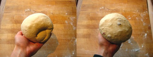 Pick the roll up in your hands and tuck the ends under. Using the same technique you used earlier to form the lump of plain dough into a ball, gently pull the top and sides of the cranberry’d dough and tuck them underneath to form a smooth ball. Sprinkle sparingly with a little bit of flour if it sticks to your hands too much, and don’t worry if a few cranberries burst through.