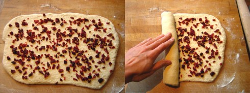 Sprinkle the dough with a few handfuls of chopped dried cranberries, covering the dough evenly right to the edges, then roll it up tightly from one short end.
