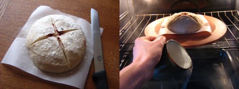 With 20 minutes to left in the rest period, prepare the oven by placing a pizza stone on the center rack and a roasting pan on a lower rack. Preheat the oven to 450˚F. When the dough is fully rested and the oven is hot, sprinkle the dough lightly with flour and slash it 1/4″ deep with a serrated knife. Place the dough and parchment paper on the preheated pizza stone, then pour a mug of hot tap water into the roasting pan. The steam will make the crust shiny and crisp.