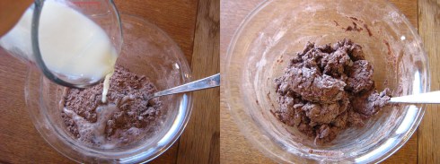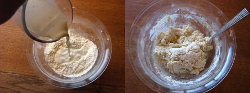 Add the milk all at once and stir briskly with a fork – think of it as more of a folding action to incorporate the dry stuff from the bottom of the bowl with the milk. Stir just until it starts to come together in a loose dough.