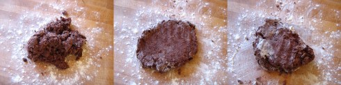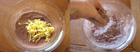 Toss the butter into the flour-cocoa mixture with a fork, then dive in there with your hands to “rub in” the butter: squeeze the butter and flour gently between your finger tips to create flat little “leaves” of butter coated in flour (this is easiest with cold, dry hands).