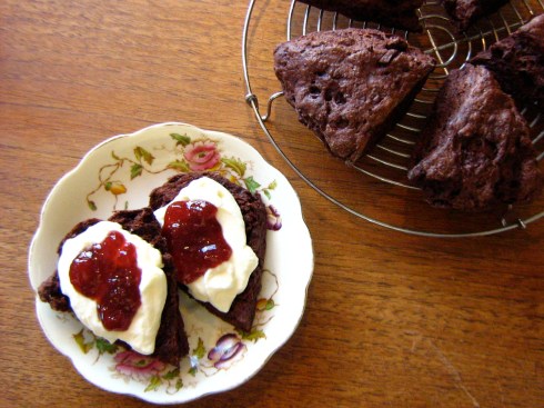 It still took me some trial and error to get these scones just the way I wanted. I was dreaming of a deep, dark, chocolately, flaky scone, and also of a more cakey vanilla bean scone with vanilla glaze (inspired by the Pioneer Woman). I added too much liquid to my first batch of chocolate scones, so they were heavy rather than flaky. However, as soon as I bit into a scone from my second batch, I knew I had gotten it right: deep, dark, and chocolatey in taste but also light and layered in texture. The cocoa powder in the dough kept them from being quite as flaky as scones made with just flour, but they were perfect paired with some Devonshire cream (recipe to come!) and strawberry vanilla jam.
