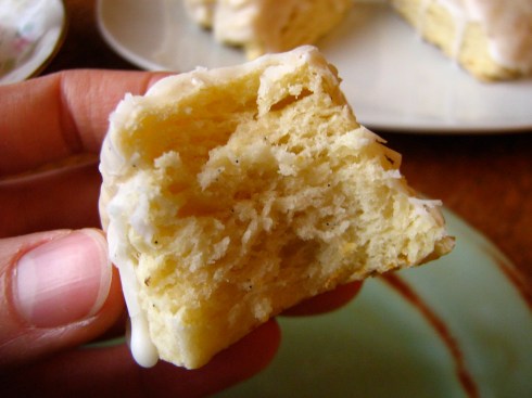 The vanilla bean scones weren’t quite vanilla-y enough the first time around, and I made the glaze too thin to actually stay on the scones, so for my second batch, I steeped the vanilla seeds and pods in warm cream, and thickened up the glaze. The result? Subtle vanilla and tender scone perfection.