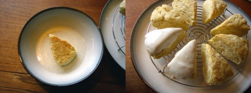 Dip the tops of the scones in the glaze, then return to the rack (sitting over a plate to catch the drips) to set.