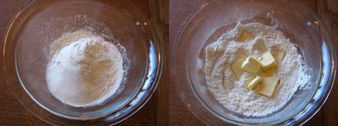 Using a pastry cutter, cut the butter into the flour until it is in very small pieces and the mixture resembles coarse bread crumbs, like this: