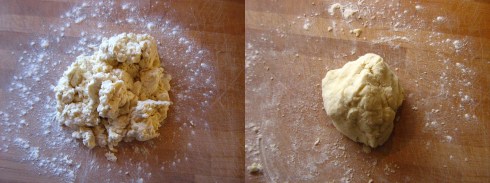 Turn the dough out onto a lightly floured surface and squeeze/knead gently once or twice to gather it together. Sprinkle it with a little flour and gently press it flat with your fingertips. Fold it in half and press flat again.