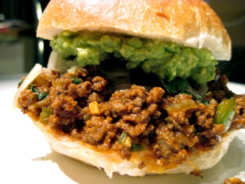 I can’t honestly remember the last time I even had a sloppy Joe, but I can assure you, it was not as good as these ones were. I am a sucker for anything Tex-Mex, so as soon as I saw this recipe on Homesick Texan (which was about 8 am on a Saturday morning!), I knew I was making them for dinner. They were awesome. A little bit spicy, a little bit sweet, a really nice mix of flavours from all the spices, a bit of creaminess from the guacamole, and very, very sloppy. I made a few changes simply because I didn’t have everything that was called for, and they still came out great. And the leftovers made fantastic huevos rancheros the next morning with some tortillas, refried beans, cheese, and eggs!