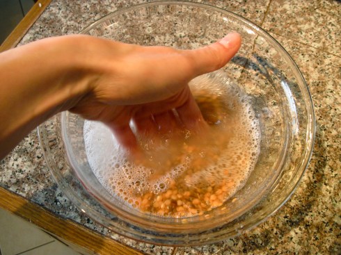 Rift through the lentils to remove any debris or tiny stones, then rinse several times in cold water.