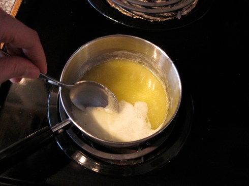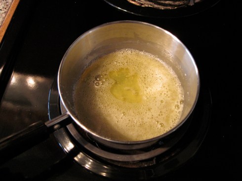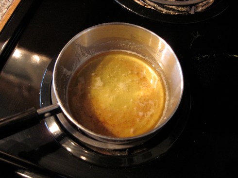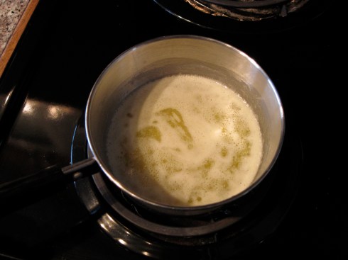 When it has melted, reduce the heat slightly and let it boil gently for a few minutes. A white foam of milk solids will form on top.