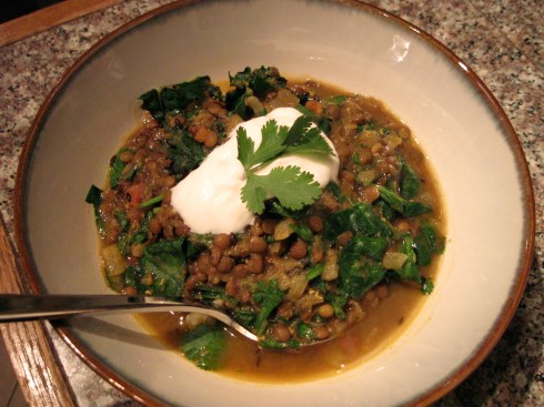 But I guess my hippie mother rubbed off on me, because I still wanted to like lentils. When I was writing my resolution post, I came across this lentil curry recipe (aka dal), and now I can honestly say it is one of the best things I have made – and eaten – in a while! Incredibly flavourful, a little bit spicy, and really simple to make: boil lentils, make a masala (a flavour base of sautéed spices, onion, and tomatoes in ghee), stir in some spinach, and voila. Delicious! This will make you see lentils in a very positive light ;).