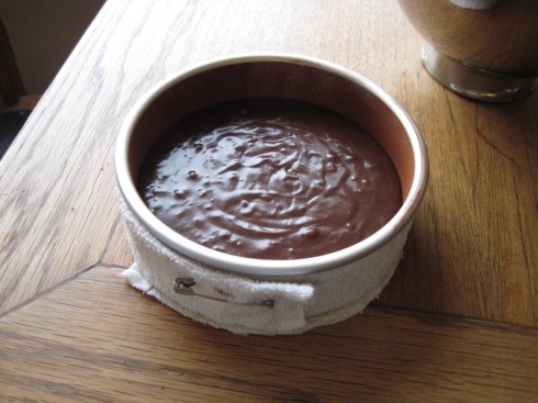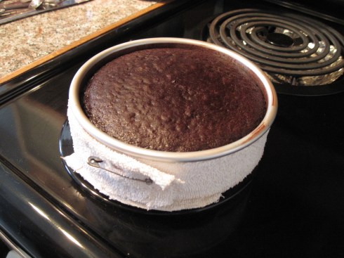 Divide the batter between the prepared pans and wrap the outside of each pan with a strip of wet towel.
