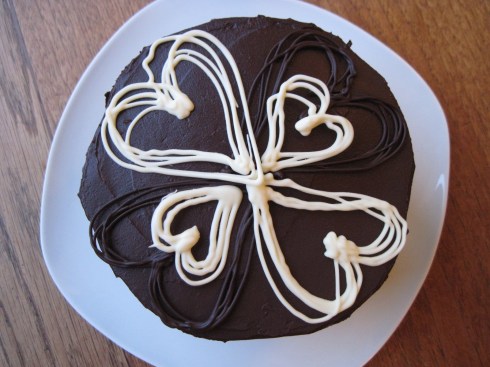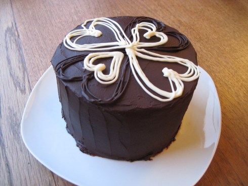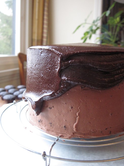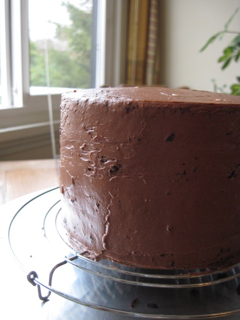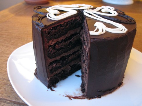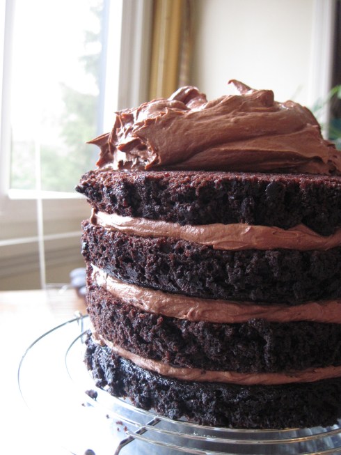 Rebar is a local restaurant that specializes in highly delicious, mostly vegetarian cuisine, and in addition to food like this amazingly decadent chocolate layer cake, they are also known for their wheatgrass shots and other crunchy-granola-hippie specialties. Several years ago they came out with a cookbook and it is a favorite of mine. I’ve had this recipe bookmarked for a while and have heard rave reviews from anyone who’s made it, but I never got around to it – until now. And I am kicking myself for not having made it sooner, because I have three words for you: BEST. CAKE. EVER.