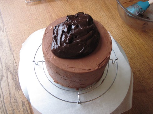 To assemble, place one layer of the cake on a cooling rack, which will help keep things neat when you pour the ganache over top. Fill the cake layers with 2/3 of the chocolate cream cheese filling, and spread the remaining 1/3 over the top and sides of the cake (it doesn’t have to be perfect as it will be covered in chocolate ganache!).