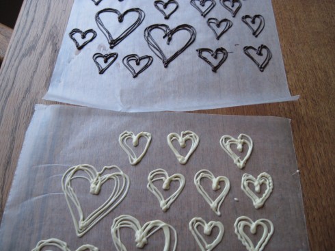 Chill again until the ganache is firm, then carefully lift the cake off the cooling rack onto a serving platter. For decoration, I piped hearts out of melted chocolate onto waxed paper, chilled them until they set, then transferred them to the cake using a thin spatula so my fingers didn’t melt them.