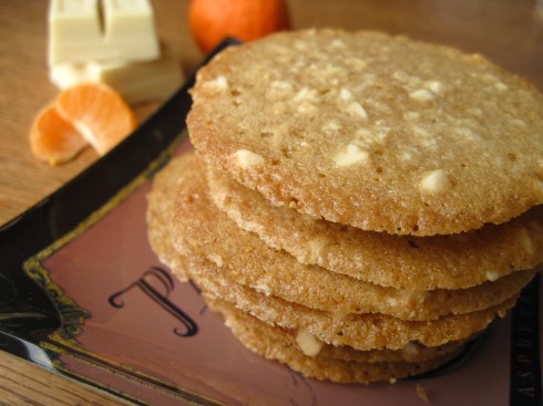 A few weeks ago I had some mandarin oranges languishing in my fruit bowl, and I decided that orange-flavoured cookies would be the best way to use them up. I pulled out my copy of Golde’s cookbook, and came across the Chocolate Thinsees recipe. Chocolate and orange is a tried and true combination, but I didn’t have any of the semi-sweet chocolate that the recipe called for. I did, however, have some white chocolate, so I decided to make White Chocolate Orange Thinsees and top them with Brazil nuts. It was a good call.