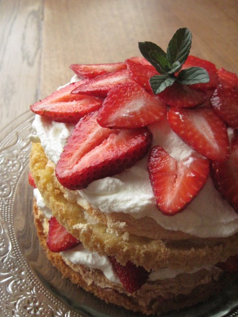 Today is my last day of work before an (unfortunately unpaid) four month summer vacation; an occasion which, I think, merits a cake. This strawberry shortcake torte actually made its appearance as dessert after Easter dinner, and it disappeared pretty darn quickly. Really though, what’s not to like? Lemon-scented sponge cake topped with marshmallowy meringue, layered with whipped cream and fresh strawberries.