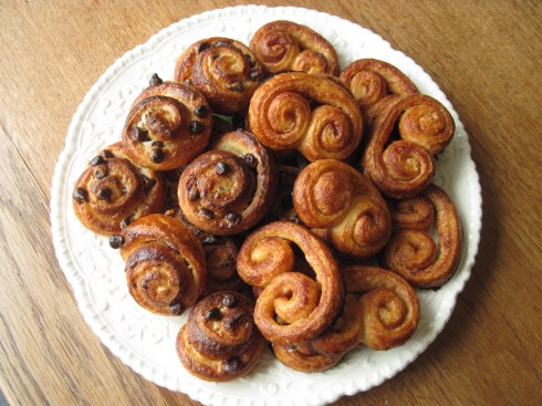 Trim the short edges of the pastry sheet so that the butter layers are showing (remember I was only working with one square quarter of the dough rather than one rectangular half, so there is no short edge). Spread with a few tablespoons of cream cheese filling and evenly scatter with a handful of chocolate chips – cover the pastry right to the edges will the cream cheese filling and chocolate chips. From one long edge, roll up the pastry, jelly-roll style, to enclose the chocolate chips and cream cheese tightly. With a large sharp knife, slice the roll into 3/4″ pieces. Turn them so you can see the spiral and re-shape them with your fingers. Unroll about 1 inch of the tail end of each spiral and firmly tuck it underneath the spiral – this will stop it from unraveling when it puffs up in the oven. Place on a lined baking sheet, cover lightly with plastic, and proof at room temperature for a few hours, until very puffy and jiggly.