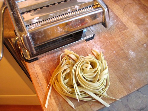 So this pain-in-the-butt actually had a happy ending, because I learned two things: one, if you are letting the fresh pasta sit for any length of time before cooking it, the drying step is crucial; and two, this dough can tolerate being man-handled rather a lot, and in fact I would recommend it – when cooked, the pasta was silky yet chewy in just the right way, and probably the best I’ve made yet. Also, drying the pasta out allows you to keep it in the fridge for a few days in a sealed Ziplock bag, which is great because this recipe made enough for two meals for me and Nate.