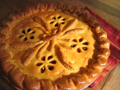 When the dough has risen, preheat the oven to 350˚F. Divide the dough in half and roll out one half on a lightly floured surface to fit the bottom of a 10″ pie plate (the dough should be about 2 or 3 millimeters thick). Line the pie plate with the dough and fill it evenly with the cooled filling.