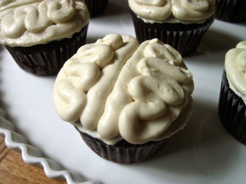 To make the brains, pipe a line down the middle of the cupcake, slightly off-center, then pipe around the edge of the cupcake to make a half-circle or the letter “D”. Fill the space in the middle with brain-like squiggles. (Ideally you want to do all of this in one smooth motion, without stopping or lifting the piping tip.) Repeat in mirror-image on the other side, making it as symmetrical as possible.