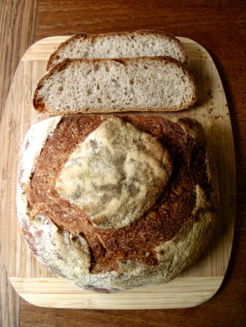 For a while I’ve been searching for a “country style” rustic sourdough loaf with some whole grain in it to bake as our daily bread, and after lots of trial and error, I finally settled on this formula, based on a recipe from Chez Pim. I was already planning on sharing it when I discovered that November’s theme for Bread Baking Day #54 is overnight bread, which is perfect, because this bread, being of my favorite no-knead, long-rest variety, fits right into that category.