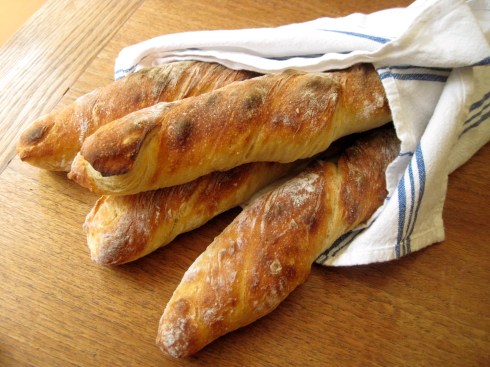 Inspired by Bitter Baker, dough from Peter Reinhart’s Artisan Breads Everyday. Makes 4 baguettes.