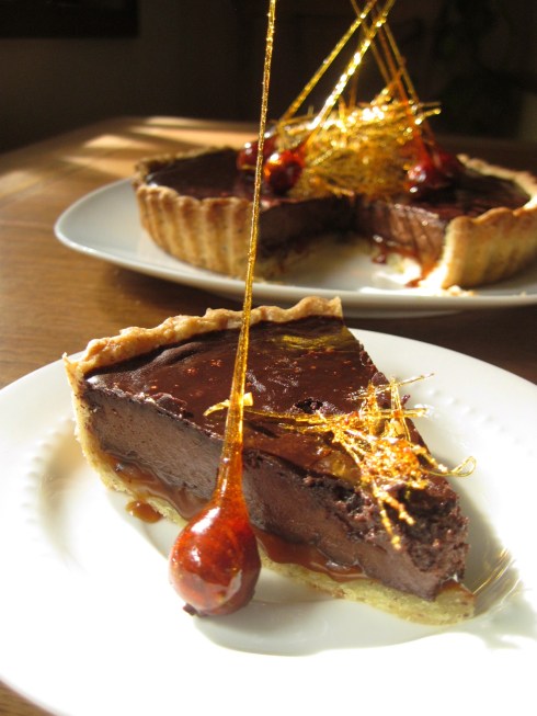 This tart has a buttery, crisp pastry shell, a thin layer of deeply flavoured caramel, and a thicker layer of dark and velvety smooth chocolate mousse. It is pretty decadent but so worth it. I added some ground hazelnuts to the crust and topped the finished tart with hazelnuts dipped in caramel for added drama. Not that a tart this good needs extra drama, but the fact that I lead a fairly drama-free life makes me feel the need to bring the drama sometimes – if only to dessert.