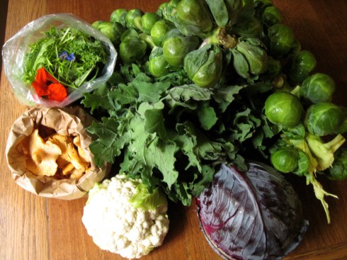 That’s $10 worth of fresh, locally-grown veggies and $10 worth of wild chanterelle mushrooms. Yes, a bit of a splurge at a dollar per ounce for the mushrooms, but when you get an entire tree of brussels sprouts for $2.50, you can be spendy in other categories! (The brussels sprouts have already gone into this pasta with bacon and feta and will undoubtedly be skillet roasted as well.)