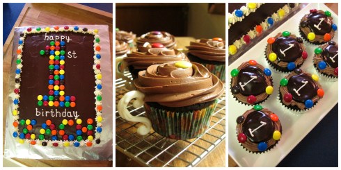 A few months later, Tanya also asked me to make a birthday cake for her son’s first birthday party. It had to feed about thirty people, so this was a monster of a cake. I was going to make my trusted rebar chocolate cake, but it contains a fair amount of coffee and there would be lots of tiny children eating this cake. Luckily, Deb at Smitten Kitchen had the solution: her own son’s fourth birthday cake, which she promised was moist and fudgy and exceedingly chocolatey without a drop of coffee. And it was already scaled to feed thirty people! So I made two 9″ x 13″ layers, stacked them up with the rebar chocolate cream cheese frosting on top, smothered the whole thing in ganache, and then set about getting all geometric with M&Ms to make a number one and spell out the birthday boy’s name. I would have used Smarties (for my American readers, Smarties in Canada are rainbow-coloured candy-coated chocolate, not the powdery little candies in a roll, which are called Rockets here) but I was also asked to make some gluten-free cupcakes, and Smarties contain gluten but M&Ms do not. See? You learned something!