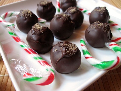 This year I dipped the ganache centers in tempered chocolate (I used David Lebovitz’s tempering method) using a handy little chocolate dipping tool that I picked up at Bulk Barn for a few dollars, but I’ve done it successfully in the past with a fork or chopsticks. If you don’t want to temper the chocolate, that’s fine – you’ll just need to store the truffles in the fridge to keep the chocolate from “blooming” – that is, turning chalky white and streaky (it’s fine to eat, it just doesn’t look as nice). Or forgo the chocolate dipping entirely and just roll the ganache centers in cocoa powder. Any way you do it, these will be delicious and you will receive high praise from everyone you share them with!