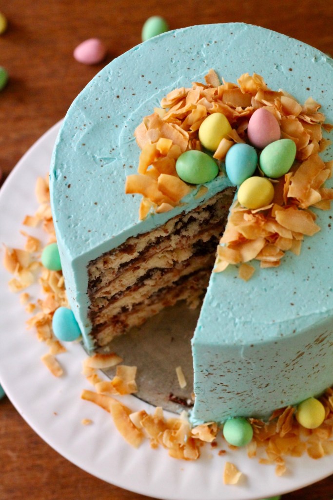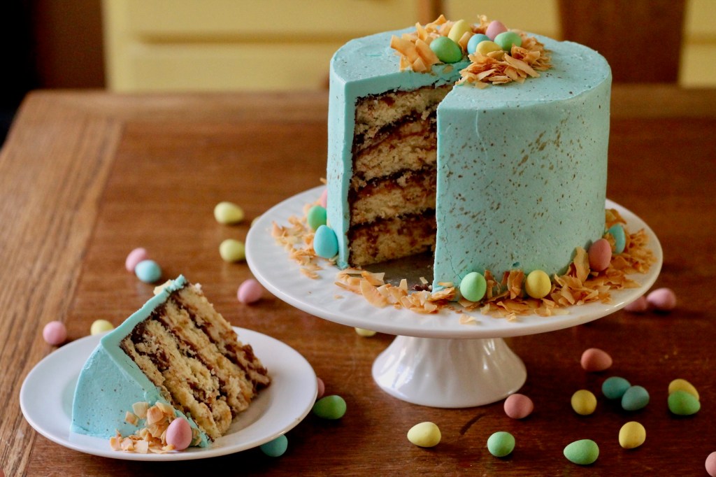 This cake has four layers of toasted coconut sponge filled with coconut pastry cream, toasted coconut flakes, and chocolate ganache. The frosting is Swiss meringue buttercream tinted blue and speckled with a mixture of vanilla extract and cocoa powder that you flick over the cake with a paint brush. And of course, toasted coconut nests and mini eggs for decoration (because let’s be real, buying a large bag of mini eggs is the true reason I wanted to make this cake!).