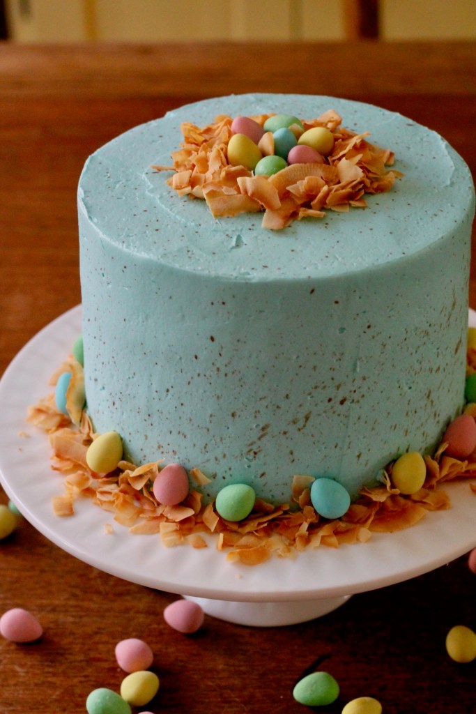 Every Easter I see these pretty speckled robin’s egg cakes pop up all over the food internet, and I’ve been wanting to make one myself for a while. I’ve also been wanting to make a coconut layer cake, so I combined the two and here we are!